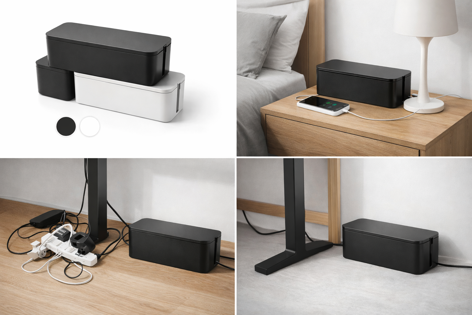 This minimalist cable management box is designed to conceal power strips and organize wires for a cleaner workspace.